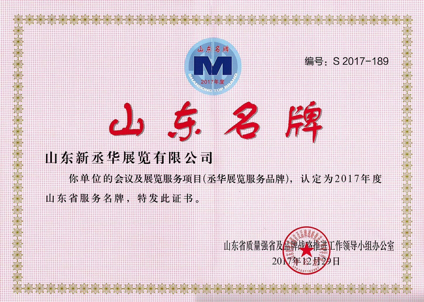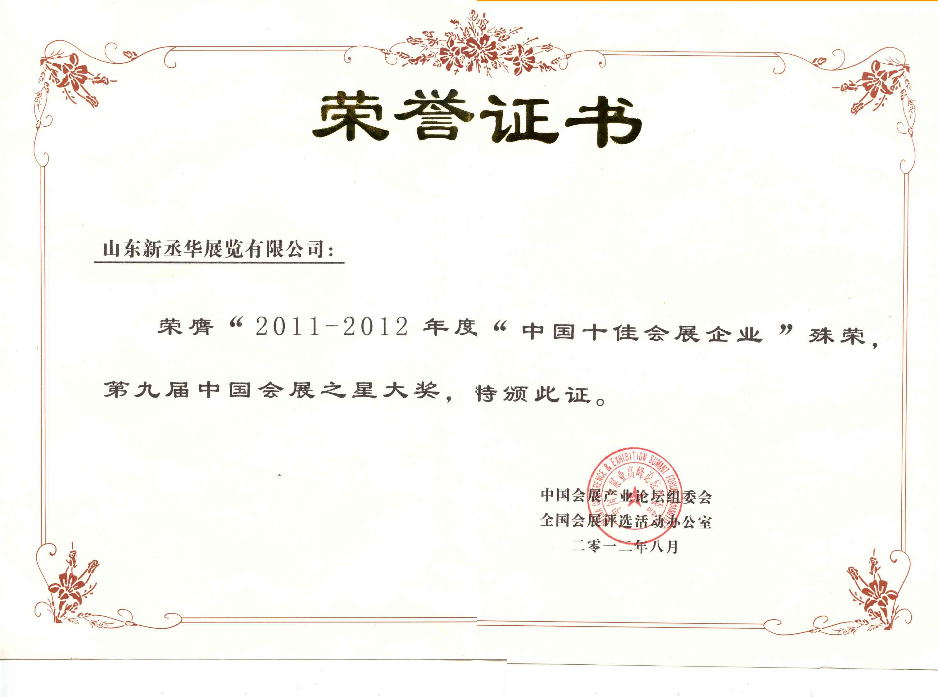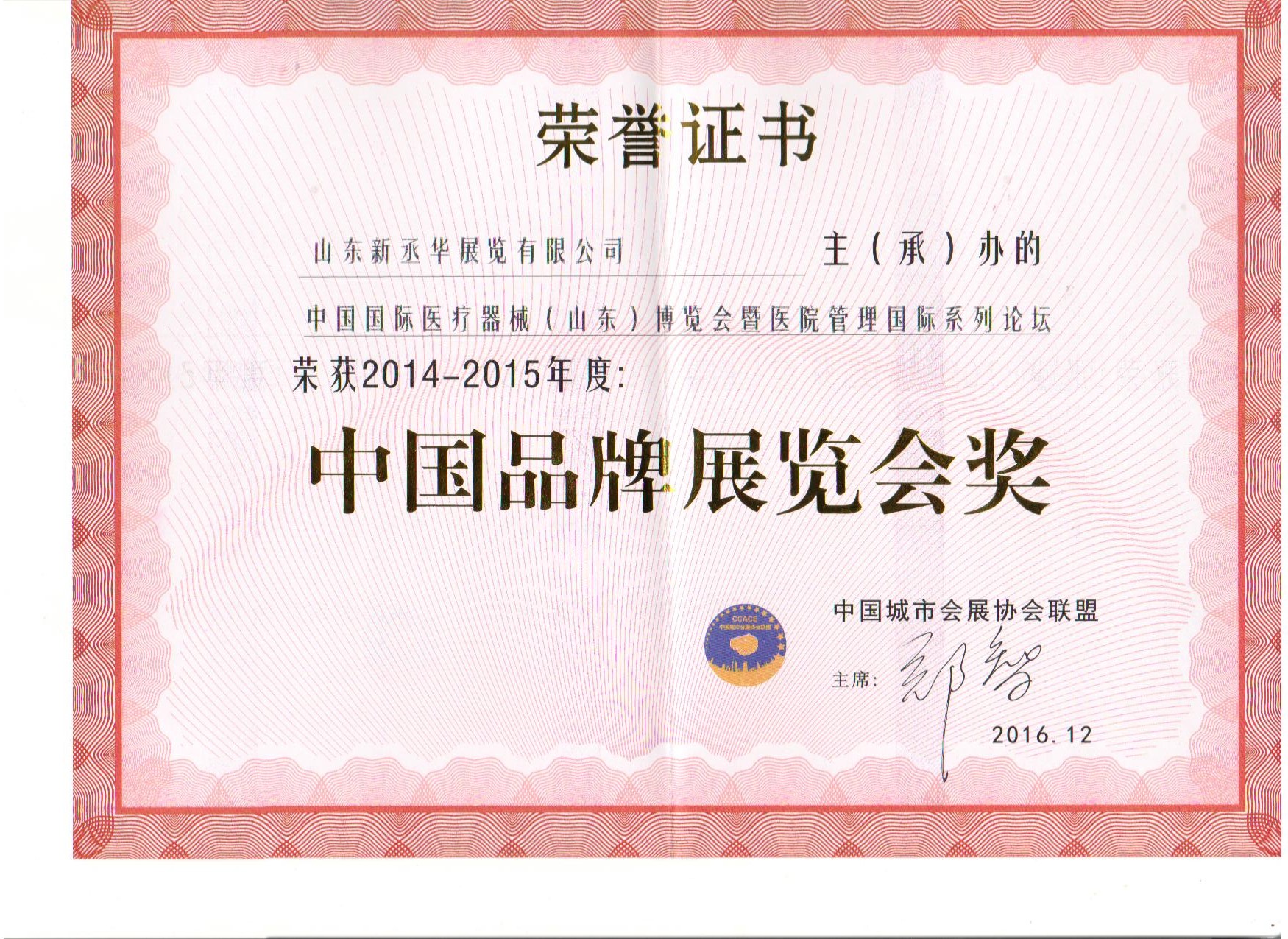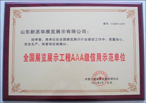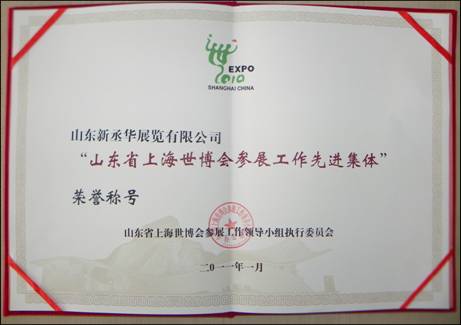 新丞華國際會(huì)展(山東)集團(tuán)有限公司,先后榮獲了“濟(jì)南市建功立業(yè)先進(jìn)單位”、 “濟(jì)南市優(yōu)秀會(huì)展企業(yè)”“山東省會(huì)展行業(yè)優(yōu)秀會(huì)展組織者”、“2010年度中國十大優(yōu)秀會(huì)展公司”、“濟(jì)南市先進(jìn)民營企業(yè)”“山東省服務(wù)名牌”等近三十項(xiàng)榮譽(yù)稱號(hào)。