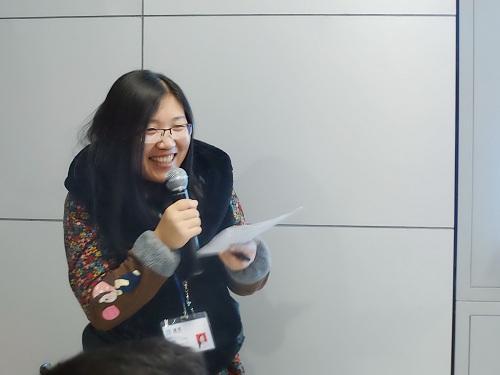 公司新員工代表項(xiàng)目三組張麗麗在分享“建筑產(chǎn)業(yè)化專業(yè)觀眾的邀約心得”