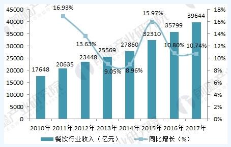 我國(guó)餐飲業(yè)發(fā)達(dá),是全球知名的飲食大國(guó)。而且隨著經(jīng)濟(jì)增長(zhǎng),人們生活水平提高,在餐飲方面的消費(fèi)與日俱增。據(jù)國(guó)家統(tǒng)計(jì)局?jǐn)?shù)據(jù)顯示,2017全年我國(guó)餐飲收入為39644億元,較上一年同比增長(zhǎng)10.74%。