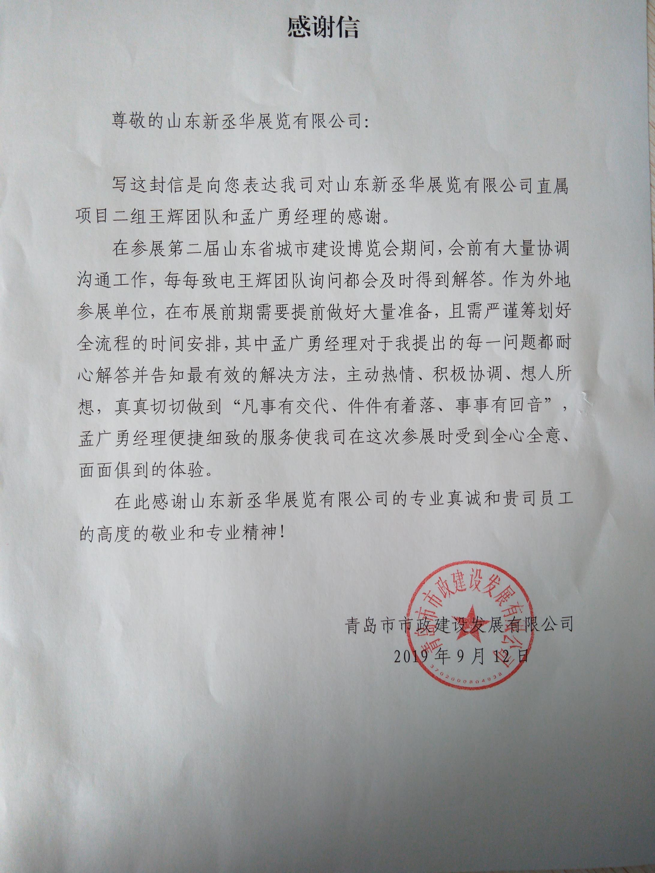 寫這封信是向您表達(dá)我司對山東新丞華展覽有限公司直屬項目二組王輝團(tuán)隊和孟廣勇經(jīng)理的感謝。