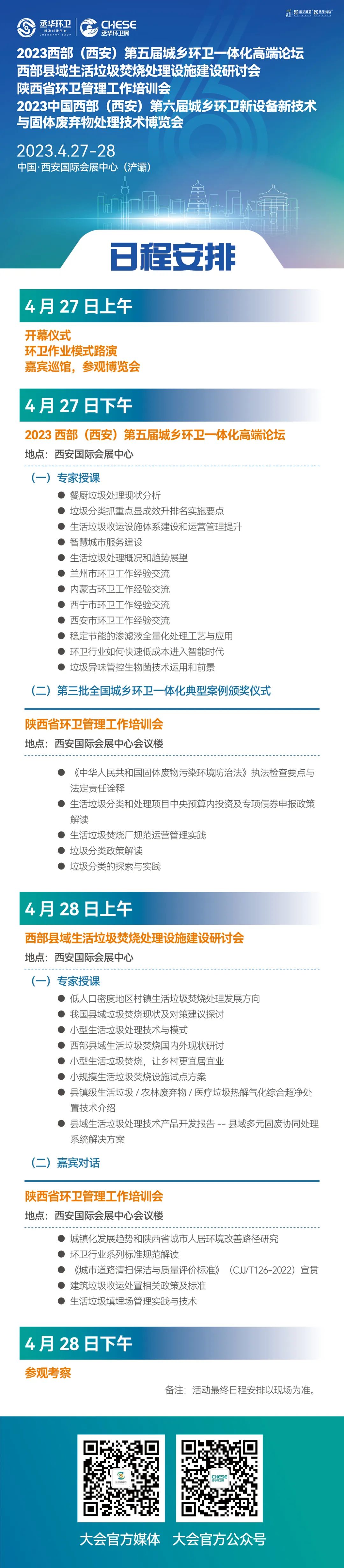 2023西部(西安)第五屆城鄉(xiāng)環(huán)衛(wèi)一體化高端論壇、西部縣域生活垃圾焚燒處理設(shè)施建設(shè)研討會(huì)及陜西省環(huán)衛(wèi)管理工作培訓(xùn)會(huì)各有側(cè)重,邀請(qǐng)政府部門領(lǐng)導(dǎo)、知名專家學(xué)者、品牌企業(yè)大咖等共同參與,以專家授課、嘉賓對(duì)話、城市交流等多種形式,助推西部地區(qū)環(huán)衛(wèi)行業(yè)新發(fā)展!應(yīng)廣大參會(huì)代表和觀眾要求,現(xiàn)就整體活動(dòng)初步日程安排進(jìn)行公布,歡迎了解!