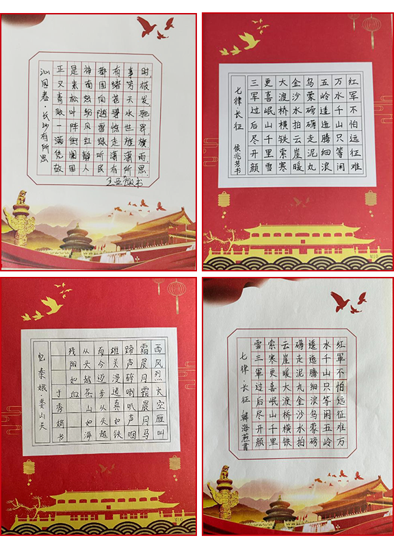 以史為鑒,可知興替;以詩為馬,莫負韶華。本次參加活動的黨員們用堅定的筆觸,澎湃的心情重溫革命語錄、抄寫紅色詩詞,字里行間深切地感受黨的光輝發(fā)展歷程。書寫的作品結構均勻,筆畫流暢,橫平豎直整齊美觀,落筆之處或輕或重,或緩或急,橫、豎、撇、捺、點間,可以看出大家的認真態(tài)度。“紅軍不怕遠征難,萬水千山只等閑”、“雄心寫壯志,和諧奔復興”、“漫天風雪滿天愁,革命何須怕斷頭”、“雄關漫道真如鐵,而今邁步從頭越”……從一篇篇的抄錄作品中,我們仿佛又看到了中國共產黨那段艱苦卓絕的奮斗歷程,體會了革命先烈不屈不撓、英勇頑強的大無畏氣概。