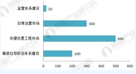 根據(jù)前瞻產(chǎn)業(yè)研究院發(fā)布的《2018-2023年中國(guó)餐廚垃圾處理行業(yè)發(fā)展前景預(yù)測(cè)與投資戰(zhàn)略規(guī)劃分析報(bào)告》預(yù)計(jì),“十三五”期間整個(gè)餐廚垃圾總體市場(chǎng)空間可達(dá)1000-1500億元。其中餐廚垃圾收運(yùn)體系建設(shè)約需200億(收運(yùn)體系其中包括垃圾容器、車輛,包括車輛和垃圾容器之間的銜接)、處理處置工程市場(chǎng)約需500-1000億、日常運(yùn)營(yíng)市場(chǎng)大約是300億、監(jiān)管體系建設(shè)大約能形成20億左右的市場(chǎng)規(guī)模。