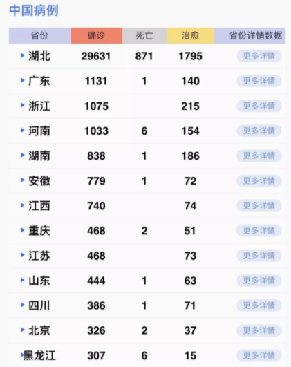 據(jù)31個?。ㄗ灾螀^(qū)、直轄市)和新疆生產(chǎn)建設(shè)兵團報告,現(xiàn)有確診病例35982例(其中重癥病例6484例),累計治愈出院病例3281例,累計死亡病例908例,累計報告確診病例40171例(湖北核減87例,江西、甘肅各核減1例),現(xiàn)有疑似病例23589例。累計追蹤到密切接觸者399487人,尚在醫(yī)學(xué)觀察的密切接觸者187518人。